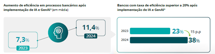 O aumento nos investimentos é impulsionado pela necessidade de fortalecer a infraestrutura tecnológica, com destaque para a adoção de Inteligência Artificial (IA), Inteligência Artificial Generativa (GenAI) e Cloud. Em 2025, os bancos planejam aumentar em 61% os investimentos em IA, Analytics e Big Data, e em 59% na migração para Cloud. Essas tecnologias visam melhorar, por exemplo, a eficiência, promover inovação e aprimorar a experiência do cliente.