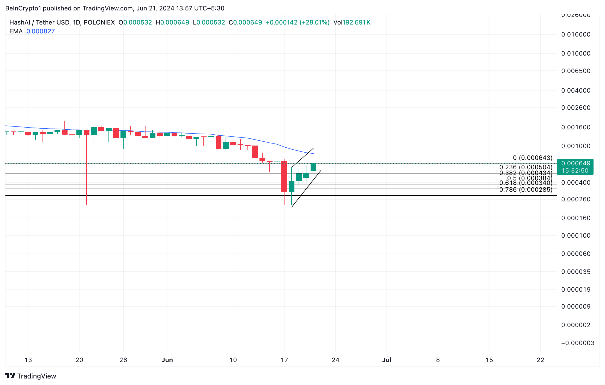 Avaliado em um gráfico de um dia, o preço da HASHAI formou atualmente um canal de alta. Esse é um sinal altista, pois esse canal é formado quando o preço de um ativo faz uma série de máximas e mínimas mais altas, criando assim uma tendência de alta.