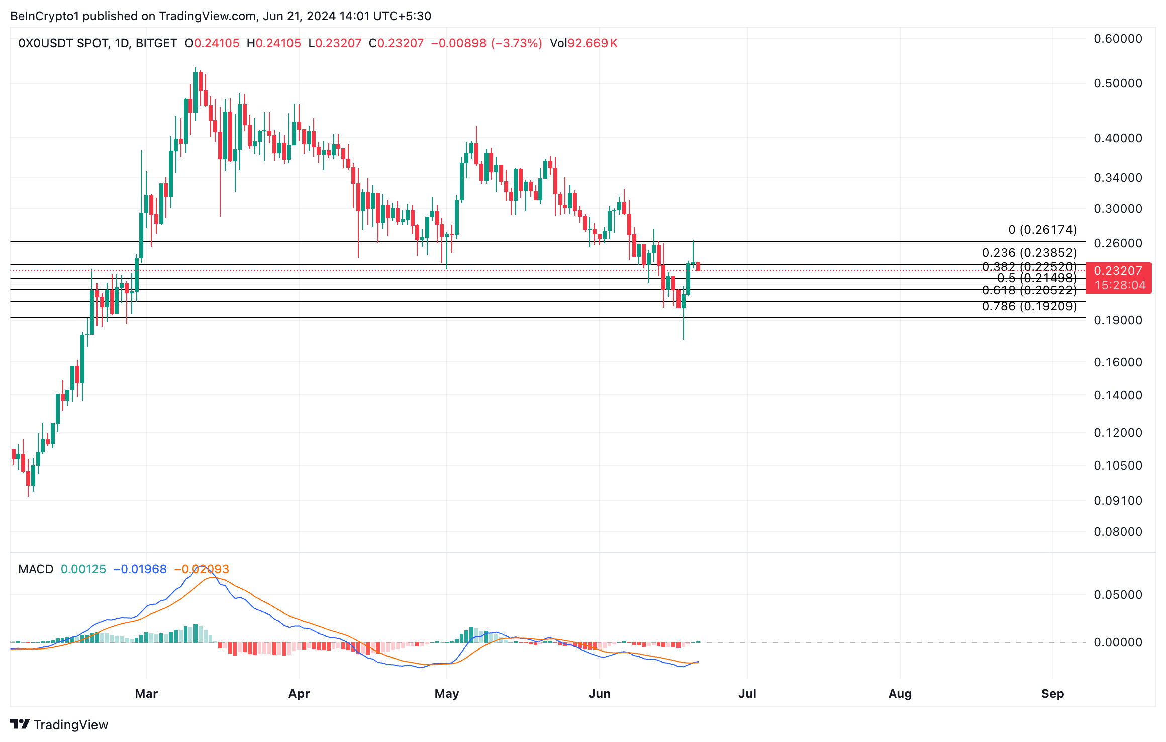 Essa recuperação ocorre após um longo período de queda no valor da altcoin. Em 18 de junho, o 0x0 fechou em uma baixa de quatro meses de US$ 0,19. No entanto, o token de IA iniciou uma tendência de alta, já que o sentimento do mercado mudou de baixa para alta. No momento em que este artigo foi escrito, o 0x0 era negociado por US$ 0,24.