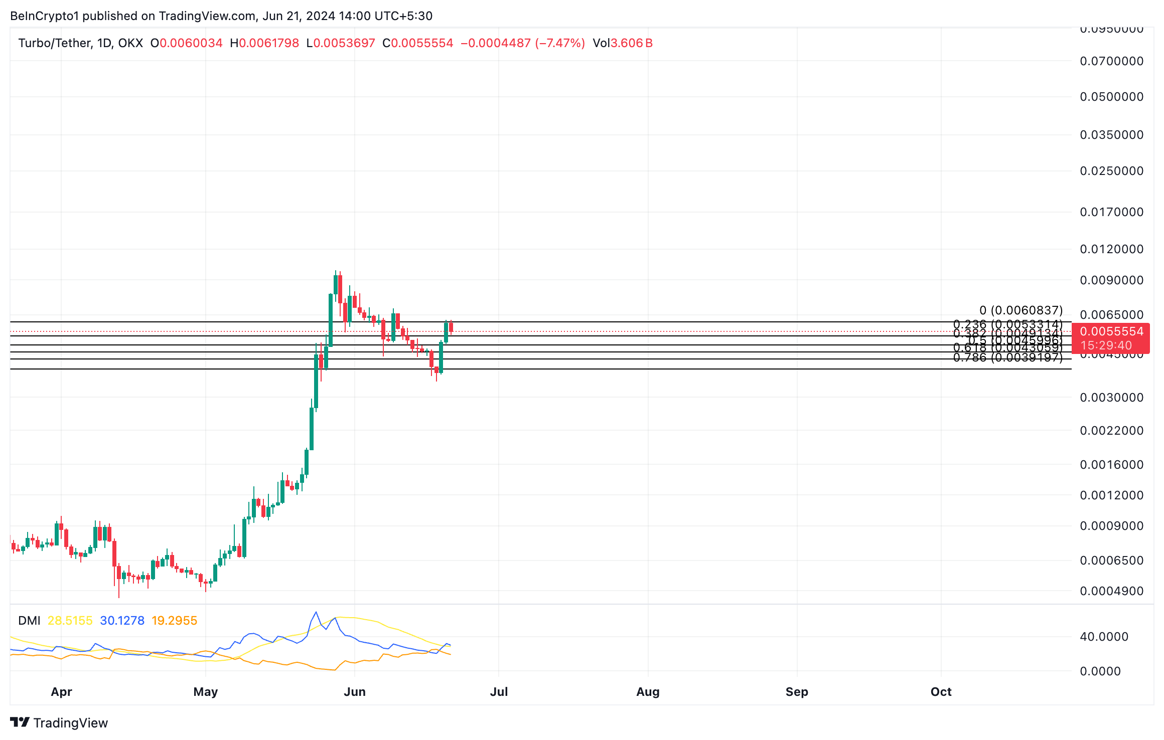 No entanto, se a atividade de realização de lucros começar, essa projeção será invalidada e o preço poderá cair para US$ 0,0053.