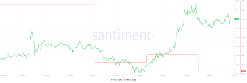 No caso do Internet Computer (ICP), o indicador ficou em torno de 86 na primeira metade de março, sinalizando um forte interesse dos compradores e uma possível condição de sobrecompra. Em seguida, caiu para 73 e atualmente está em 71, refletindo uma queda consistente.