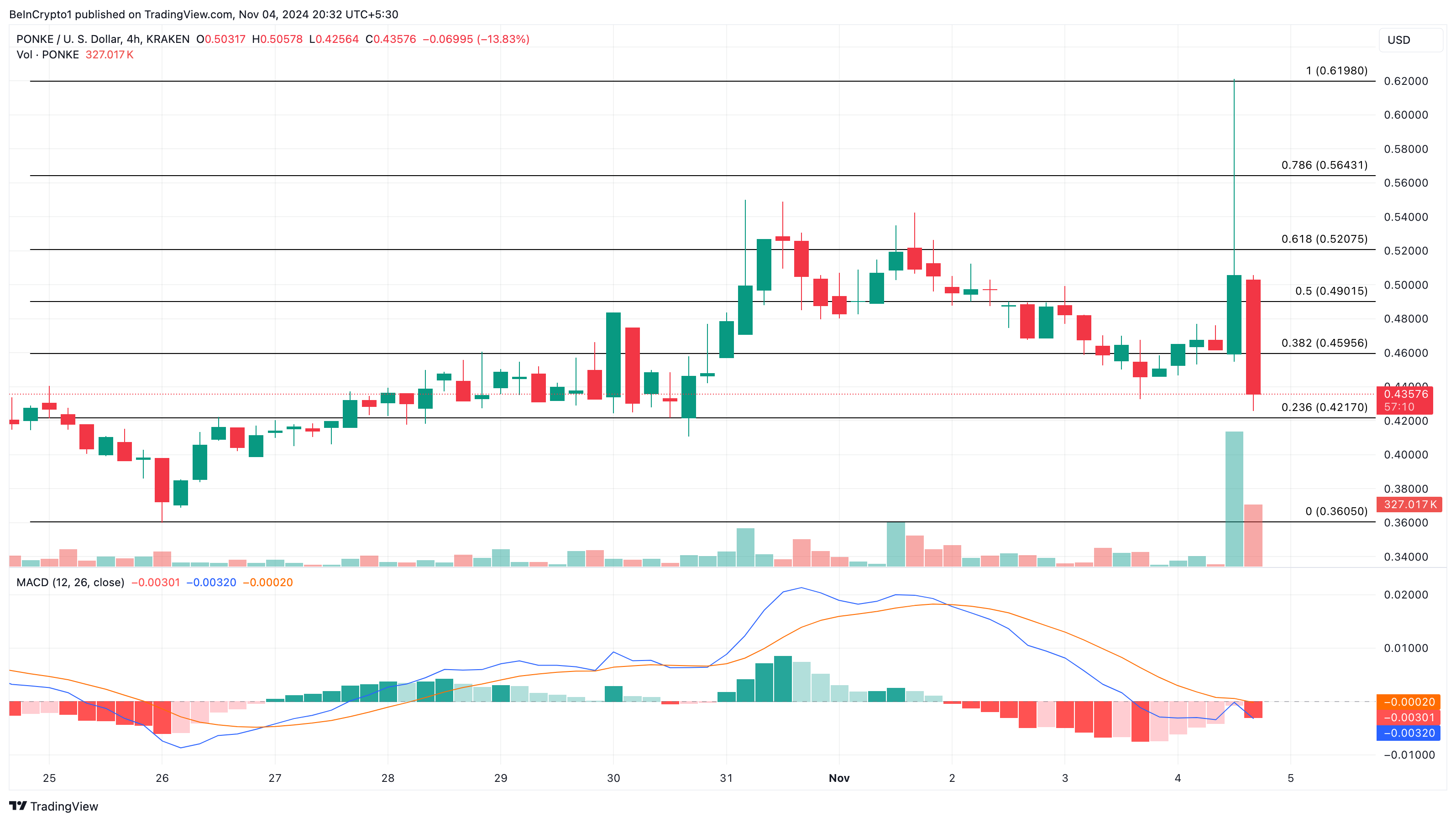 Enquanto a PONKE é negociada a US$ 0,432, o valor da cripto pode cair para US$ 0,36. No entanto, se os participantes do mercado comprarem na baixa, essa previsão pode ser invalidada, e PONKE pode subir para o ponto mais alto da mecha a US$ 0,62.