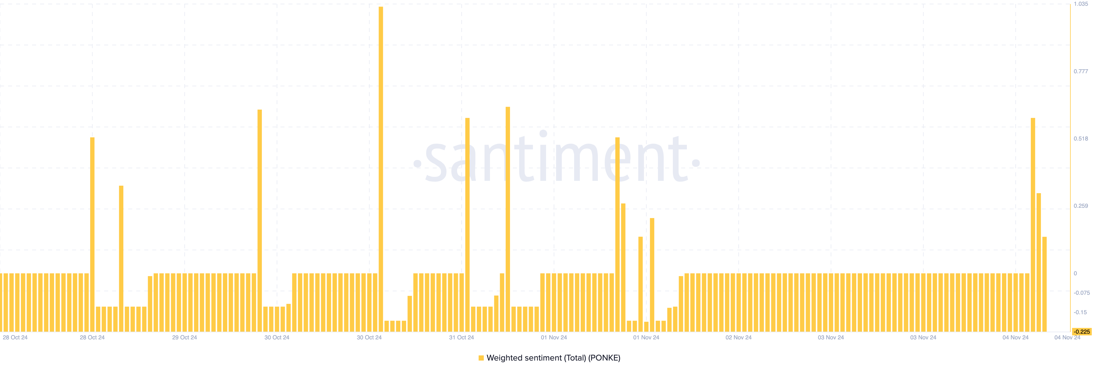 Se mantida, o preço da PONKE pode continuar a diminuir. O sentimento ponderado em torno do ativo é outro fator que sugere uma redução acelerada.