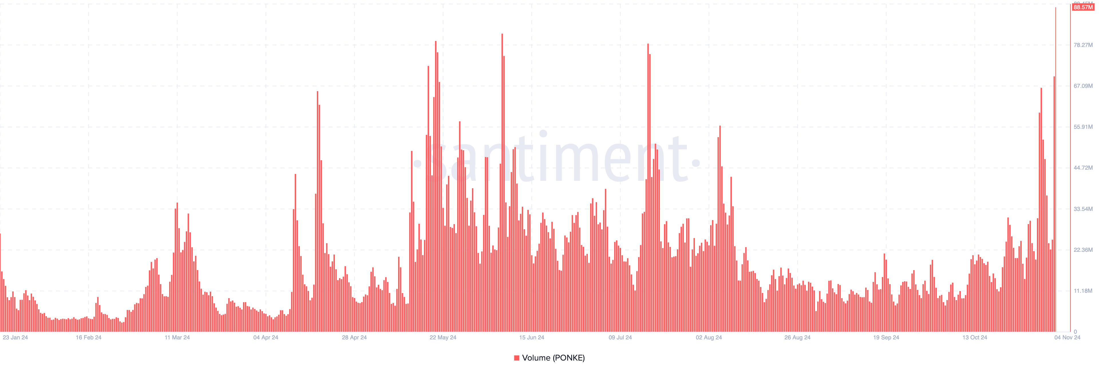 Ainda assim, o volume de PONKE disparou para um recorde de US$ 88,57 milhões. Esse aumento implica que a listagem leva a um maior interesse na cripto. Mas neste caso, o aumento do volume junto com a queda do preço é baixista, sugerindo que o indicador está fortalecendo a tendência de queda.