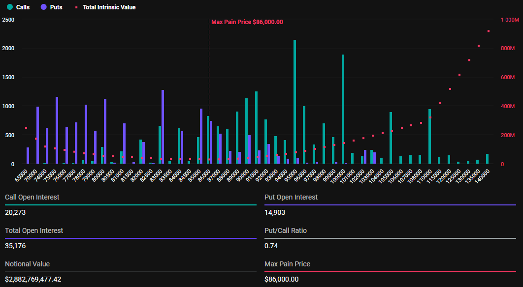 De acordo com dados da Deribit, 35.176 opções de Bitcoin vencem hoje, pouco mais do que na semana passada, quando 29.005 contratos de BTC foram encerrados. Os contratos de opções que expiram hoje têm uma relação put-to-call de 0,74 e um ponto de dor máximo de US$ 86 mil.