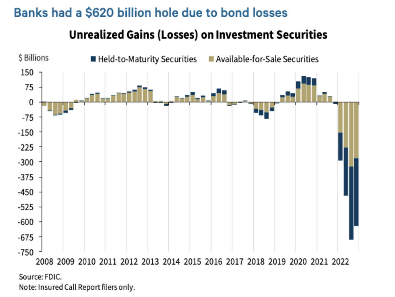 Os bancos compraram títulos do governo com depósitos extras devido ao QE durante a crise de 2020. Mas, com o aumento das taxas de juros, o preço dos títulos caiu e os bancos estão sentados com enormes perdas não realizadas.