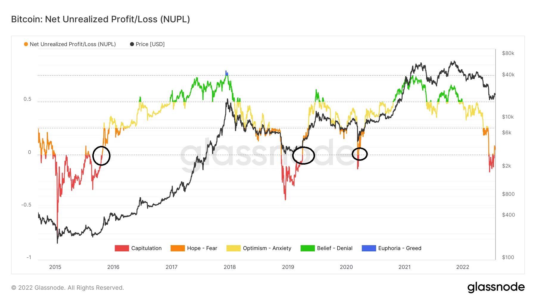 Outra maneira de olhar para o indicador é analisar o que ocorreu depois que o NUPL voltou ao território positivo depois de anteriormente ser negativo. Isso seria um sinal de que o mercado está de volta aos trilhos após um evento de capitulação.