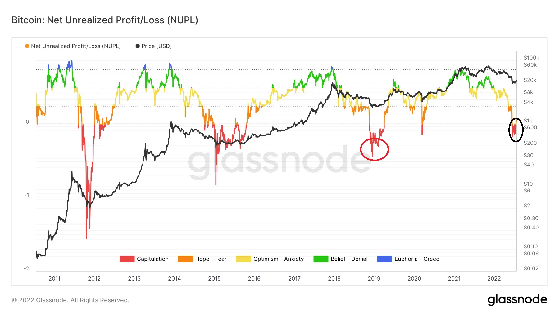 Em 13 de junho, o NUPL ficou negativo (círculo preto) pela primeira vez desde março de 2020. Ele atingiu o nível de -0,16 em 18 de junho. Isso foi menor que o fundo de março de 2020 e o valor mais baixo desde o fundo de dezembro de 2018 em -0,42 (círculo preto).