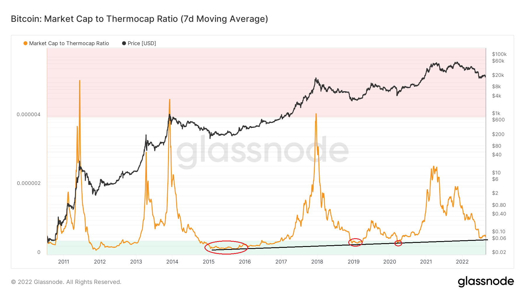 No entanto, todos os três fundos do ciclo anterior do mercado (círculos pretos) foram alcançados em valores mais altos. Mais especificamente, o fundo de 2015 foi alcançado em 0,024, enquanto o fundo de 2018 foi alcançado em 0,019 e o de 2020 em 0,020.