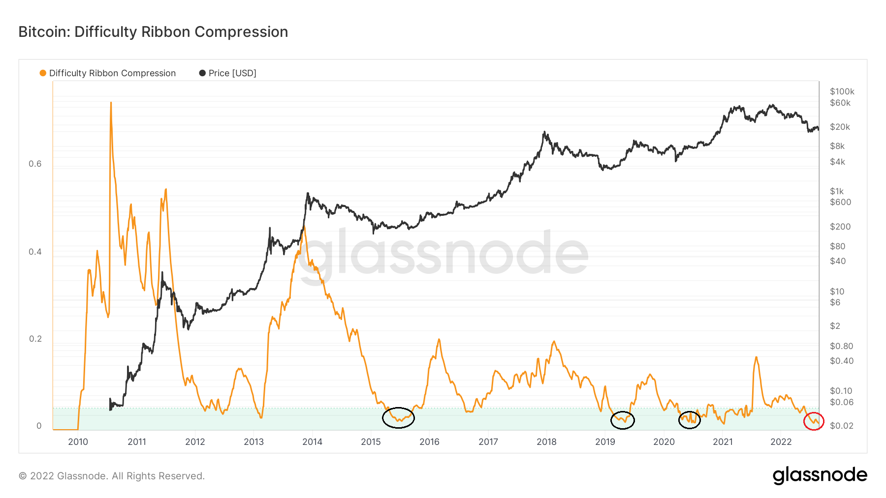 A dificuldade nas compressões da fita é um indicador on-chain que usa médias móveis (MA) da dificuldade de mineração do Bitcoin. Em seguida, a compressão da fita adiciona um desvio padrão para determinar melhor se o mercado está próximo de um fundo de preço. Historicamente, valores entre 0,01 e 0,02 têm sido associados a fundos.
