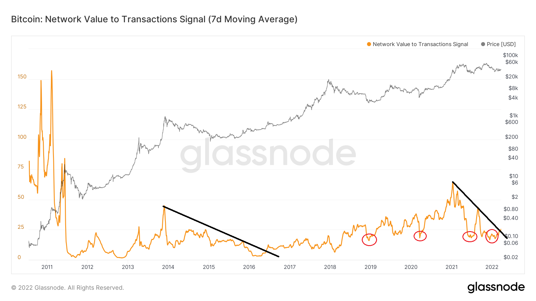 Valores altos são um sinal de supervalorização, pois sugerem que o aumento no valor da rede não é suportado por um aumento no volume de transações.