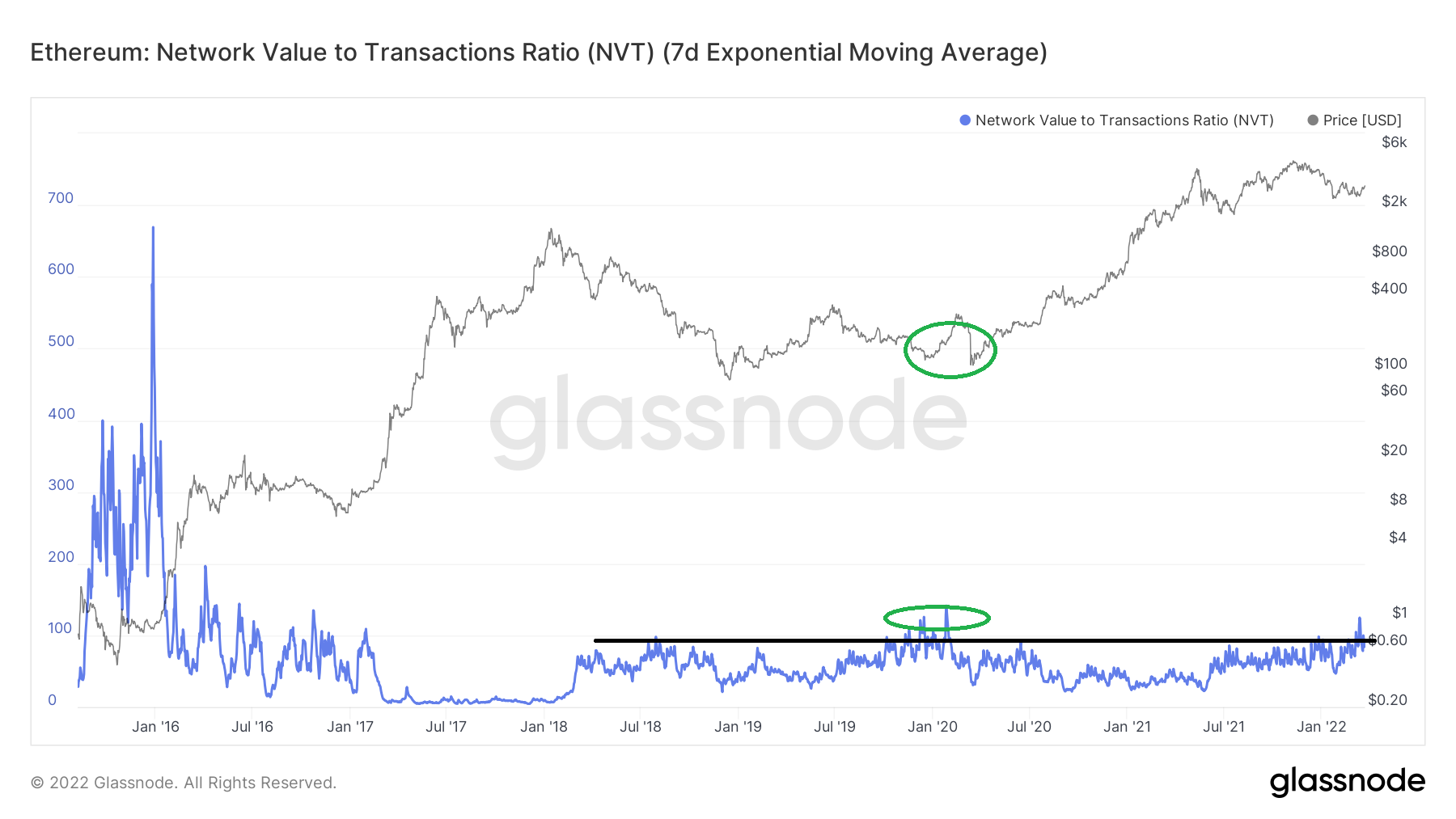 No caso do Ethereum, o NVT foi negociado abaixo de 90 (linha preta) durante a maior parte de sua história. O único desvio significativo (círculo verde) ocorreu em março de 2020, antes do início do atual rali de alta do mercado.