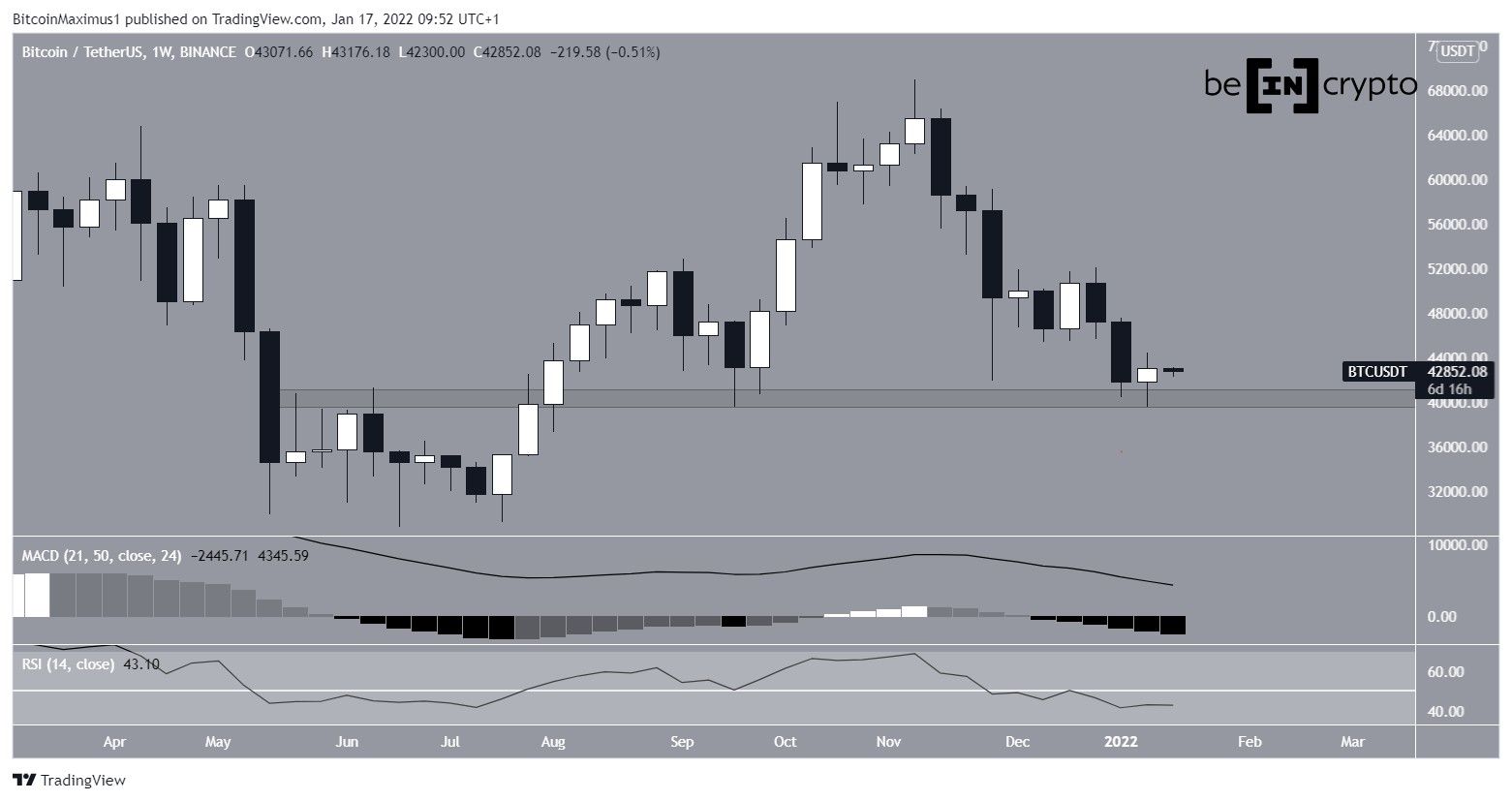 O Bitcoin fechou a semana de 10 a 16 de janeiro em ligeira alta. Ele subiu de US$ 39.650 para um topo de US$ 44.500. No entanto, todo o movimento estava confortavelmente contido no candle de baixa anterior.