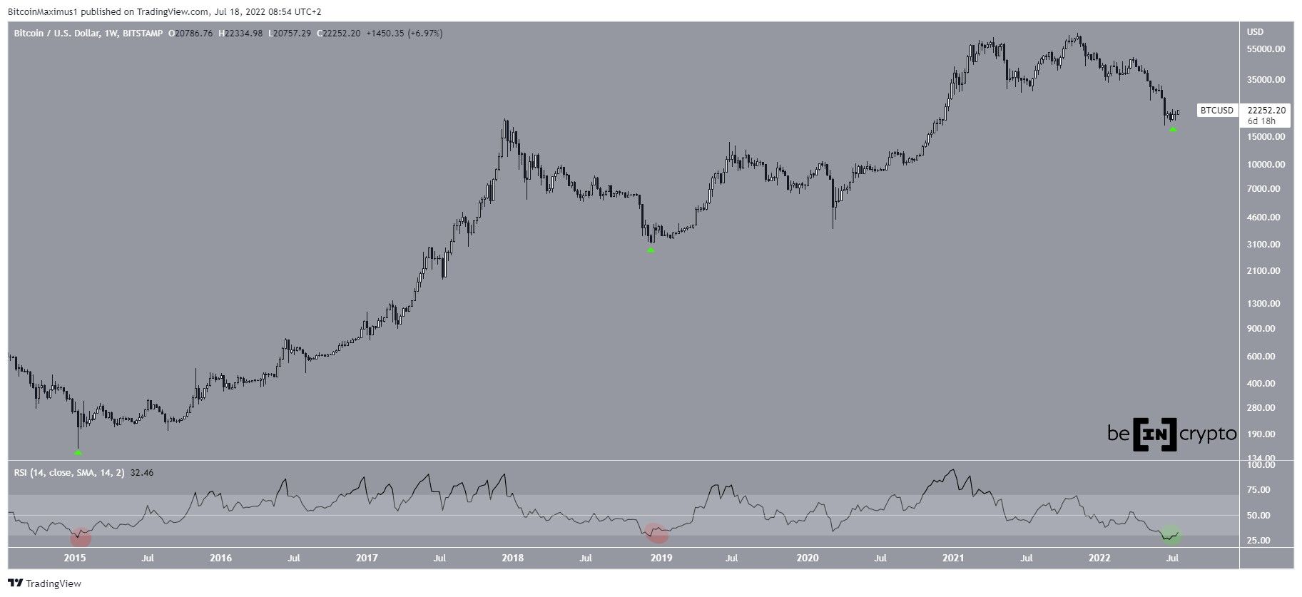 No momento da baixa, o RSI semanal caiu para o território de sobrevenda (círculo verde). Esta foi apenas a terceira vez (ícones verdes) que isso ocorreu em todo o histórico de preços do gráfico semanal doBTC.
