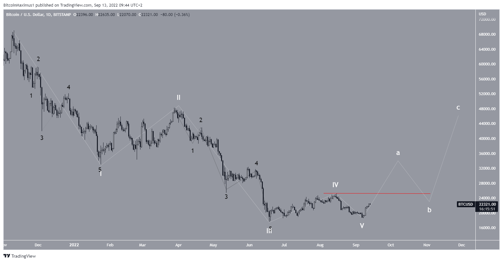 Um movimento acima de US$ 25.200 (linha vermelha) invalidaria essa contagem, enquanto uma queda abaixo de US$ 18.500 (linha verde) a confirmaria.