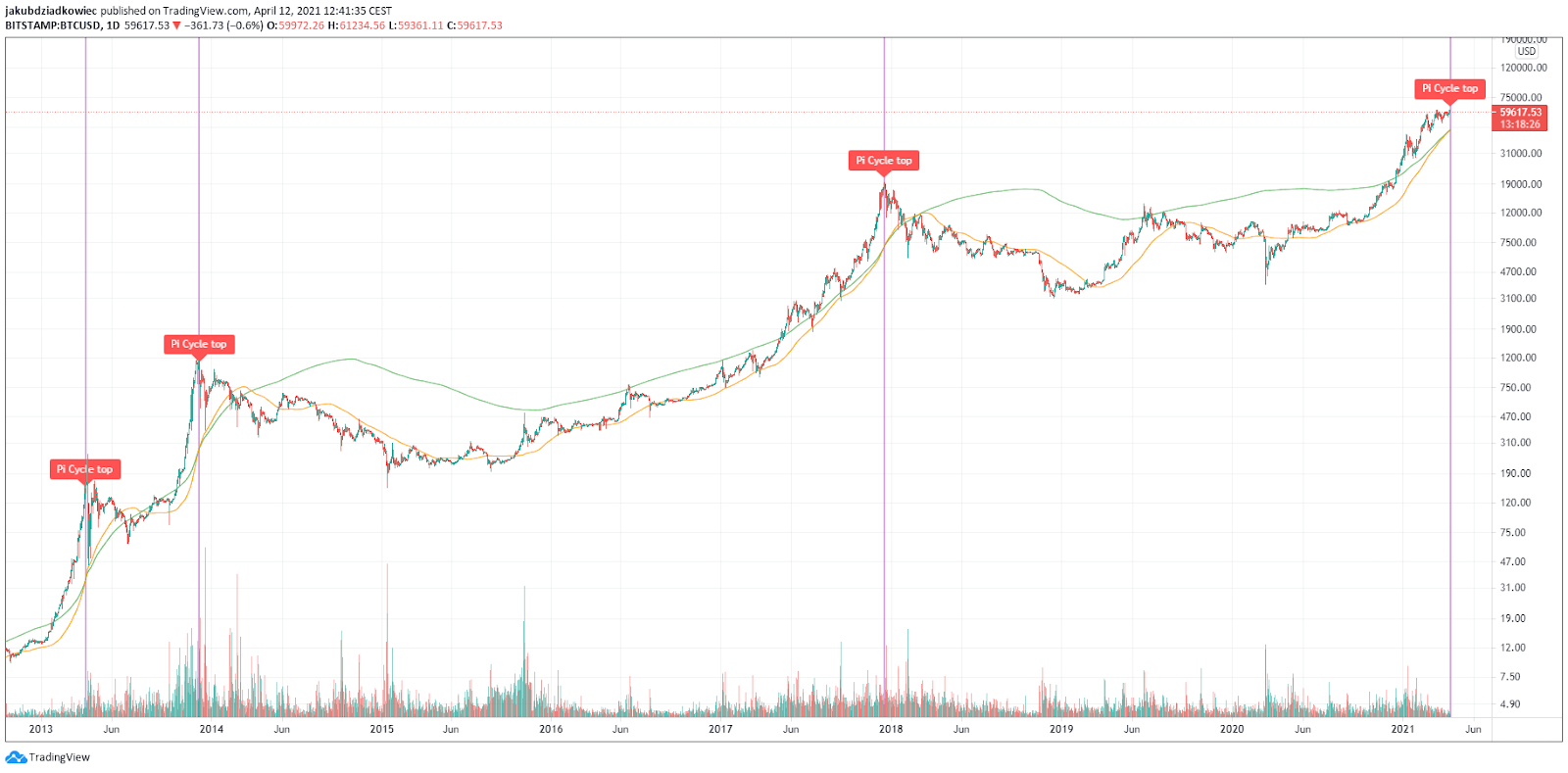 O indicador Pi Cycle Top, que indica picos máximos de ciclos de alta, acabou de ser sinalizado no Bitcoin pela primeira vez desde o grande movimento que a criptomoeda teve em 2017.