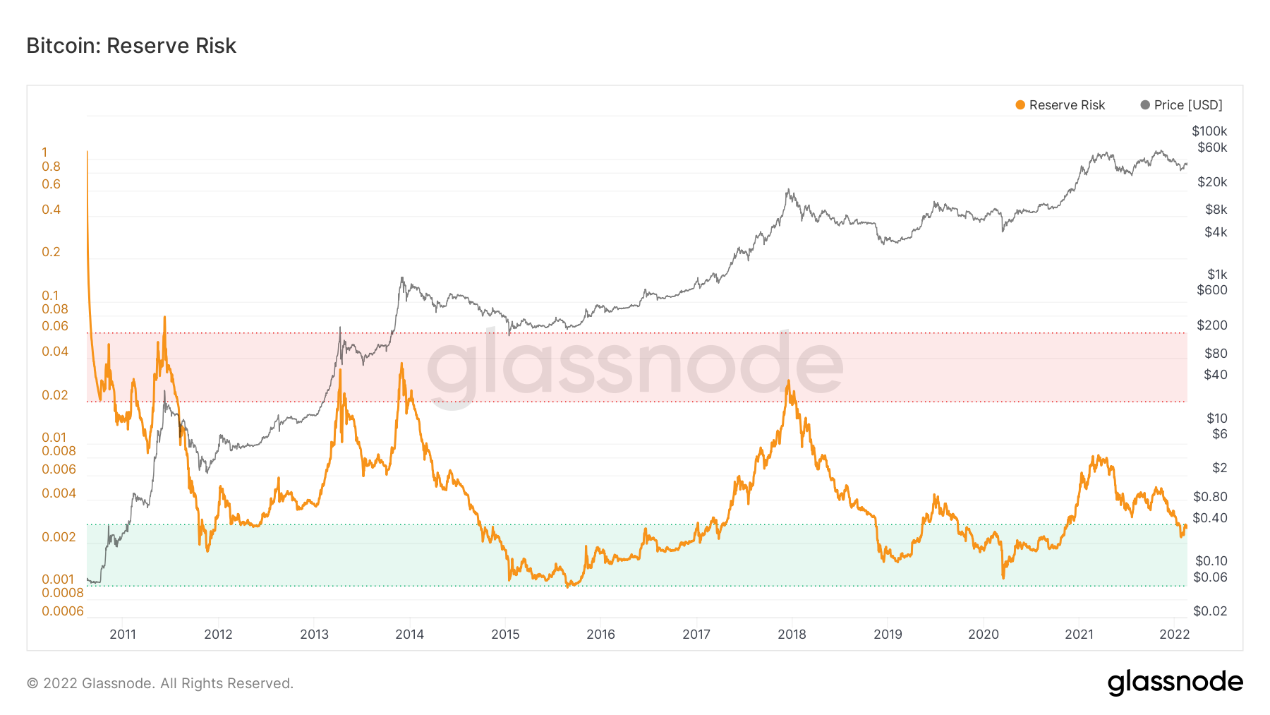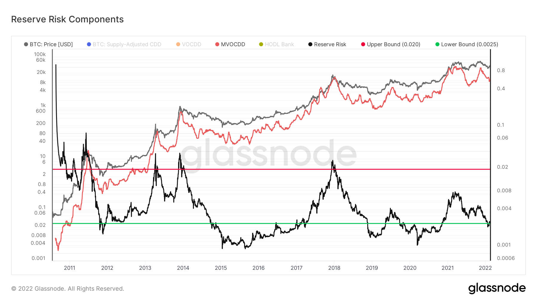 Reserve Risk é um indicador cíclico que acompanha o equilíbrio risco-recompensa em relação à confiança e convicção dos detentores de Bitcoin de longo prazo. Portanto, quando o preço está baixo em relação à confiança, isso é visto como uma boa oportunidade de risco/recompensa.