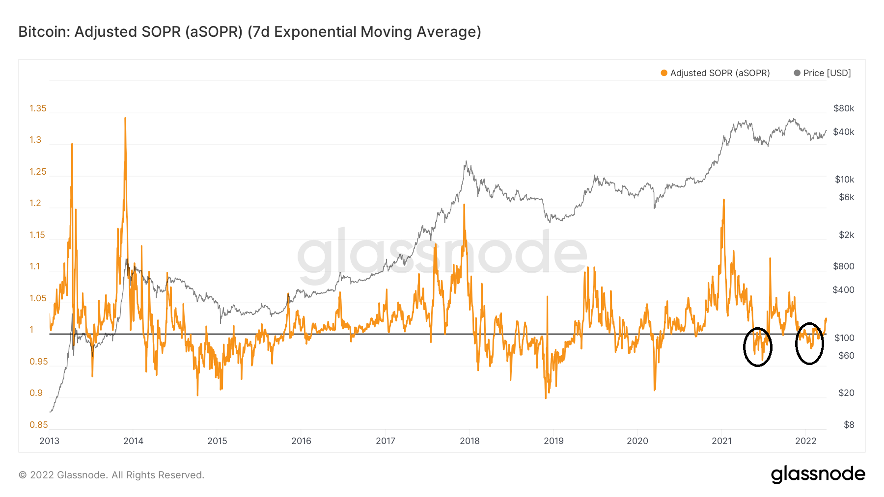 Durante períodos corretivos em mercados de alta, o aSOPR salta em uma linha e retoma sua tendência de alta. Em julho de 2021 e janeiro de 2022, o indicador caiu duas vezes abaixo de uma linha, o que colocou a tendência de alta do Bitcoin em dúvida.