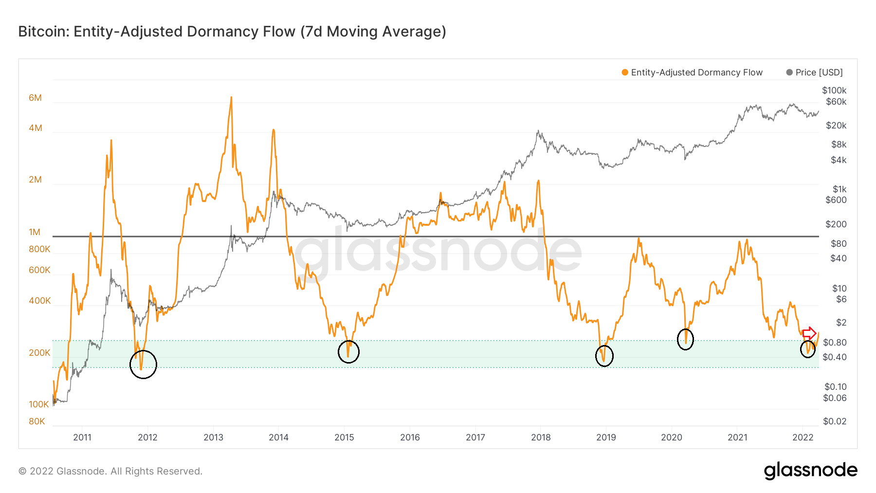 O fluxo de dormência ajustado por entidades é uma variação desse indicador que utiliza a relação entre a capitalização de mercado e os valores mencionados. O indicador é usado para prever fundos de preço. Além disso, é usado para determinar se a tendência de longo prazo é de alta ou de baixa. Historicamente, valores abaixo de 250.000 têm sido associados a fundos (círculos pretos).