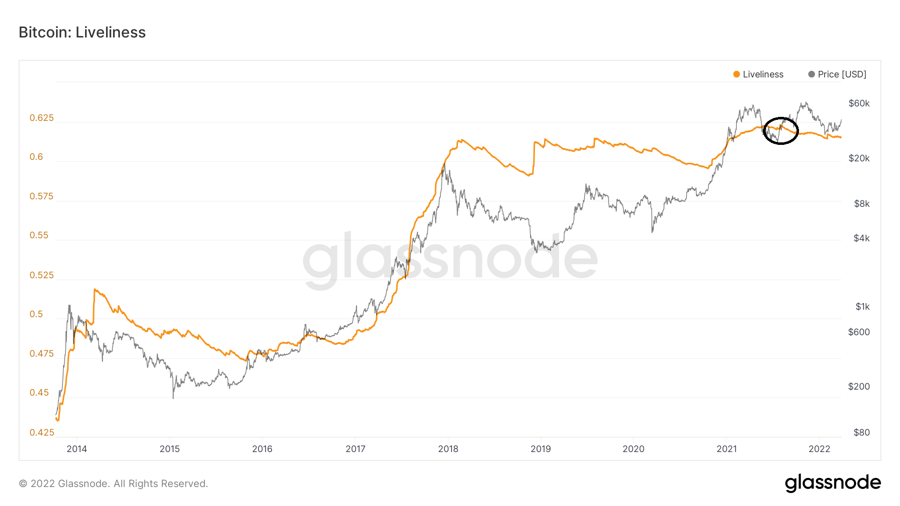 SponsoredO Liveliness vem caindo desde 30 de julho de 2021 (círculo preto), quando atingiu a máxima histórica de 0,623. Isso sugere que as moedas mais jovens estão sendo gastas durante o atual rali de preços do Bitcoin.