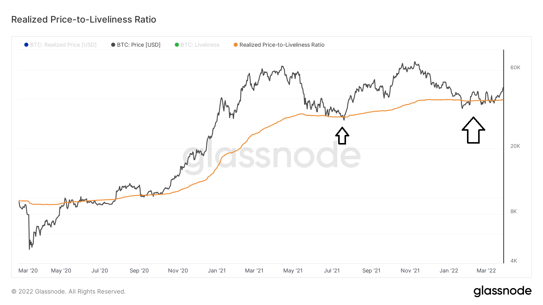 A Relação Preço-Atividade Realizada (RPLR) é uma métrica que compara os dois indicadores descritos anteriormente. Quando mais investidores estão mantendo suas posições, menos dias de moedas são destruídas. Portanto, a vivacidade cai e o RPLR, por sua vez, sobe. Historicamente, o preço do Bitcoin se moveu acima e abaixo do RPLR (laranja) várias vezes.