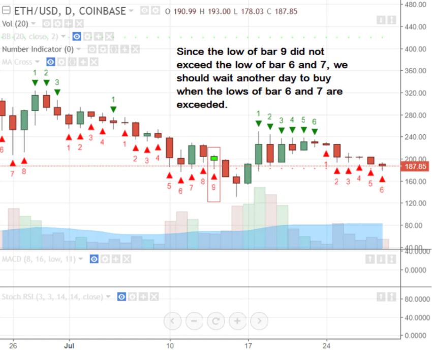 Isso ocorre quando há nove fechamentos consecutivos abaixo do fechamento de 4 barras anteriores. Uma compra ideal é quando a mínima das barras 6 e 7 na contagem é superada pelas barras 8 ou 9. Pelo contrário, aqui está um exemplo de recomendação de venda: