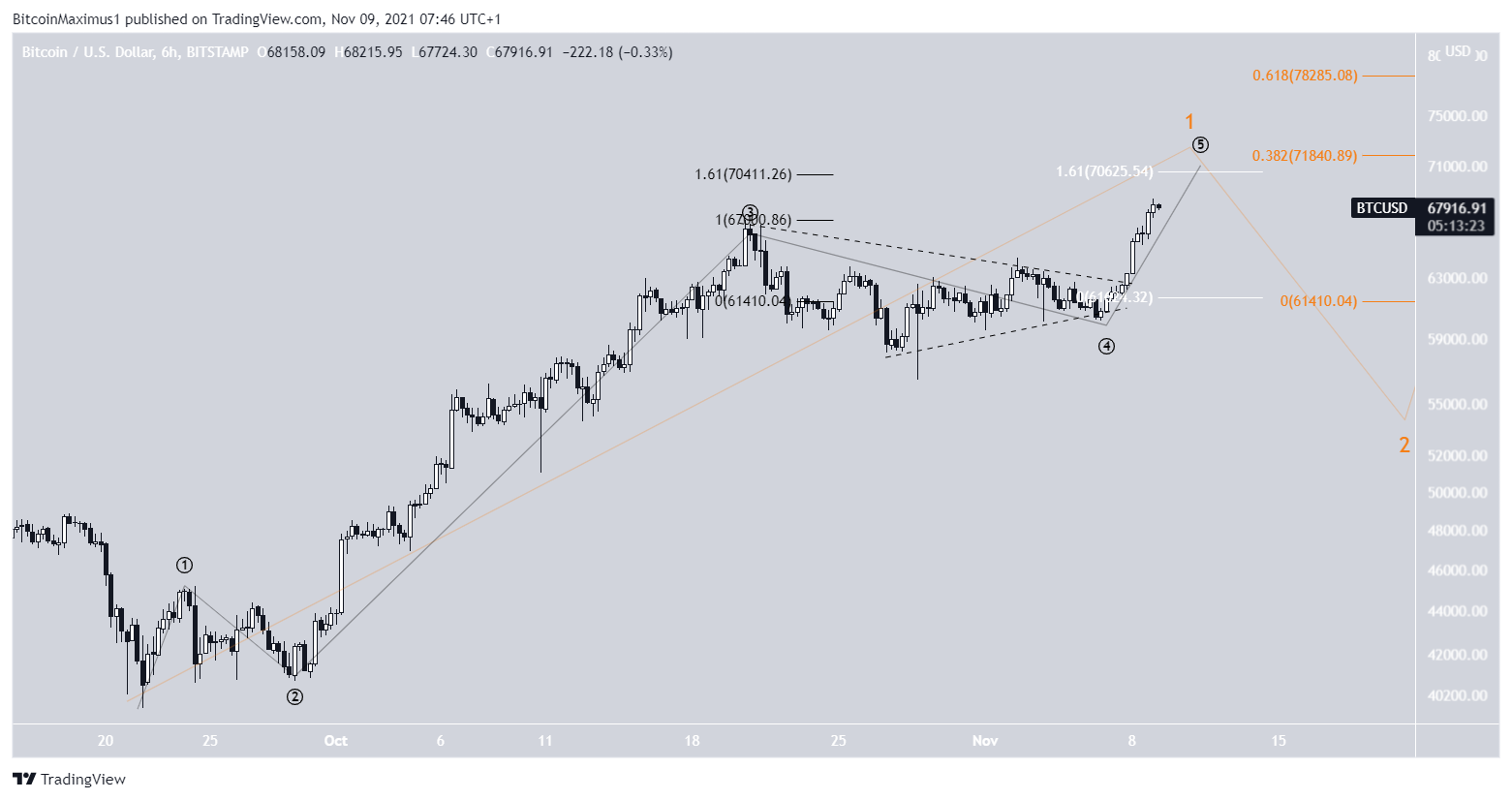O triângulo simétrico anteriormente delineado provavelmente fazia parte da onda quatro. O alvo mais provável para o topo desta tendência é encontrado entre US$ 70.400 – US$ 71.840. Este intervalo alvo é encontrado medindo: