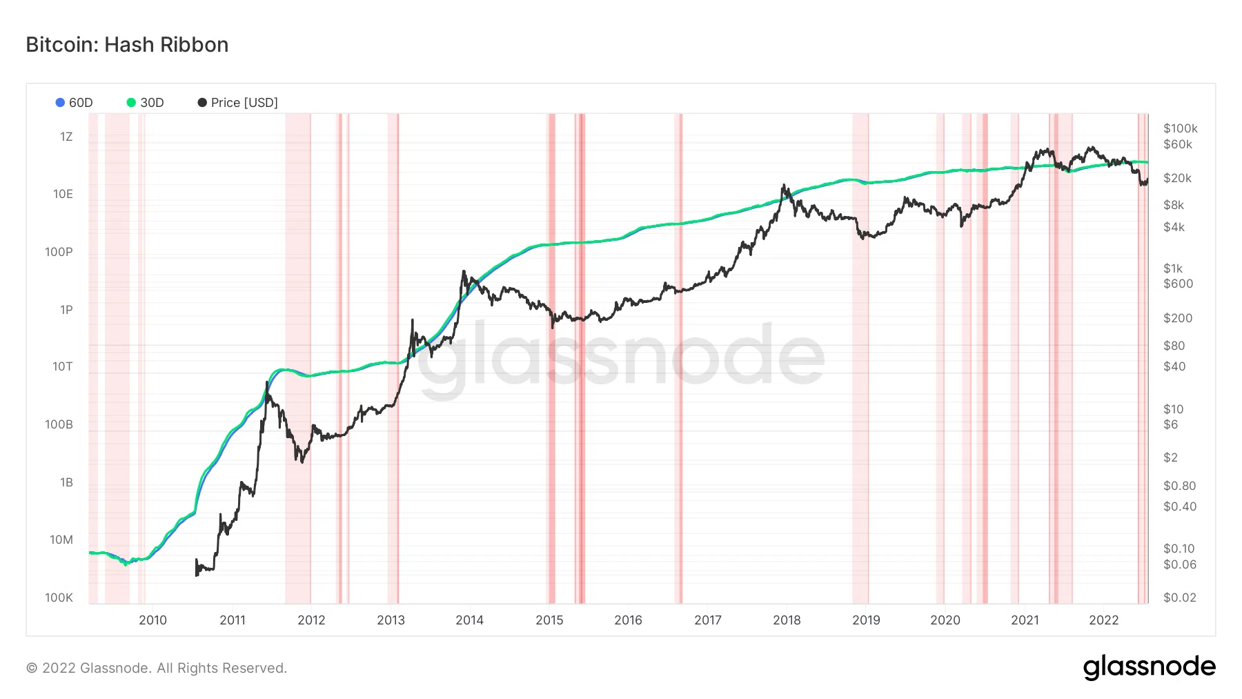 O indicador faixa de hash usa a taxa de hash para determinar se os mineradores capitularam. A capitulação do minerador ocorre quando as recompensas da mineração são menores que os custos.