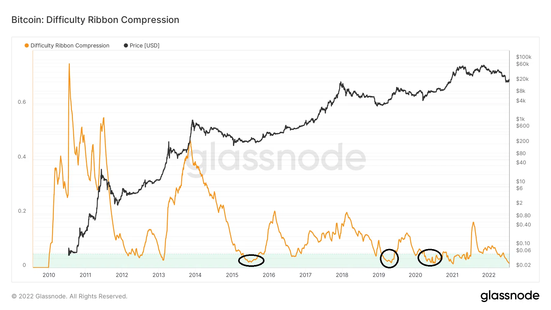 A faixa de dificuldade é um indicador on-chain que emprega médias móveis (MA) da dificuldade de mineração do Bitcoin. Em seguida, a faixa de dificuldade de compressão adiciona um desvio padrão em cima disso para determinar melhor se o mercado está próximo do fundo.