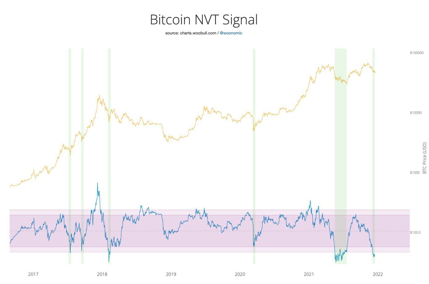Um dos indicadores é o NVT Signal, que é antigo e eficaz, particularmente quando atingiu o território de “sobrevenda”, que historicamente se correlacionou com as baixas do Bitcoin.