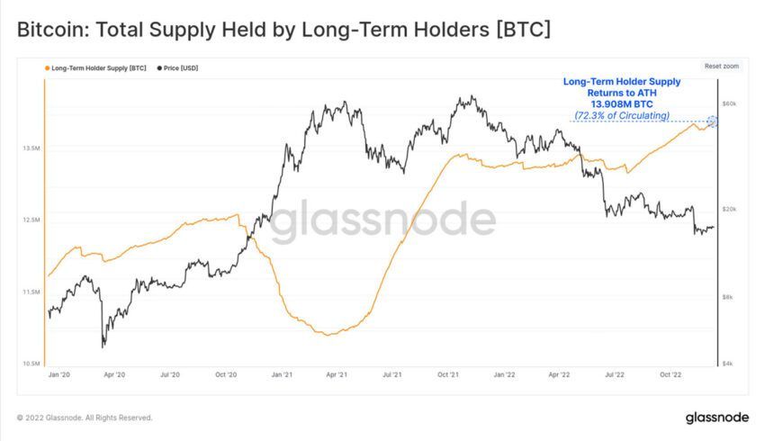 A quantidade de participações de Bitcoin de longo prazo é equivalente a cerca de 72,3% da oferta circulante.