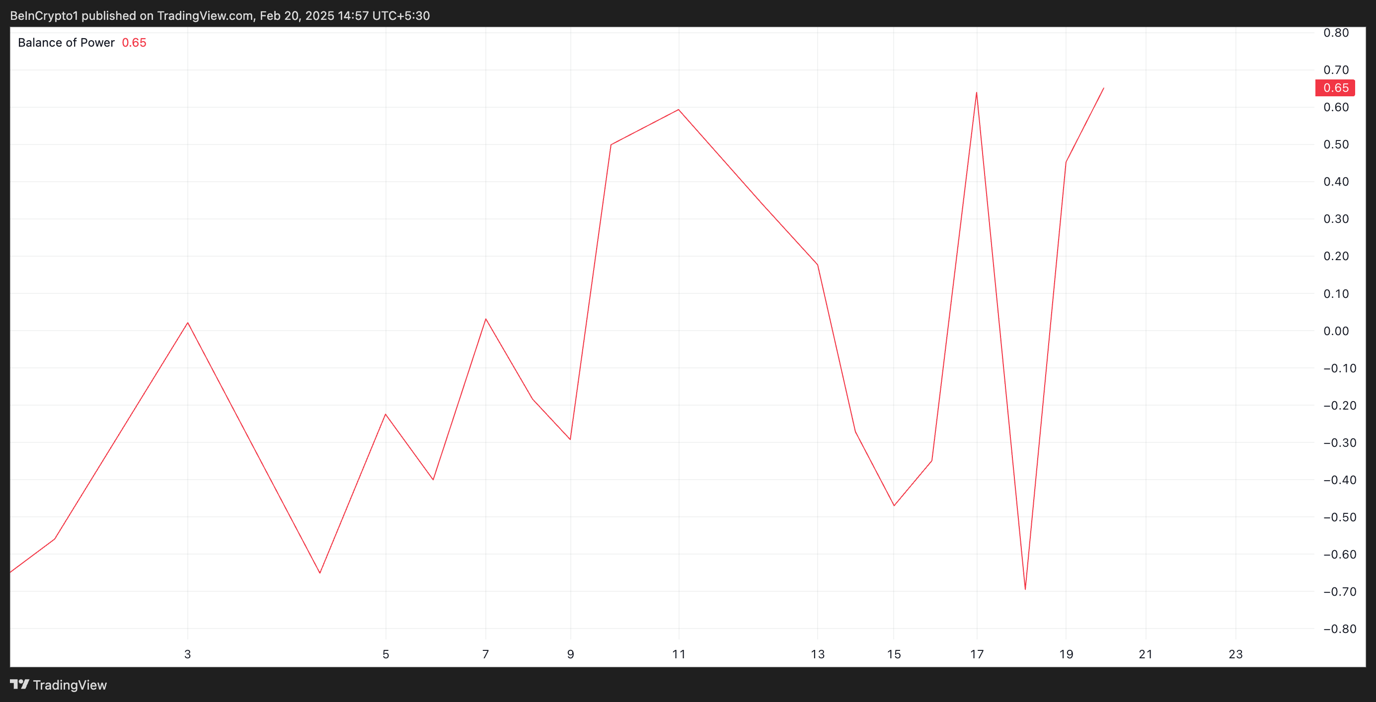 Quando o BoP de um ativo é positivo, a pressão de compra é mais forte que a de venda. Isso indica potencial de movimento ascendente e aumento do controle dos compradores sobre o mercado.