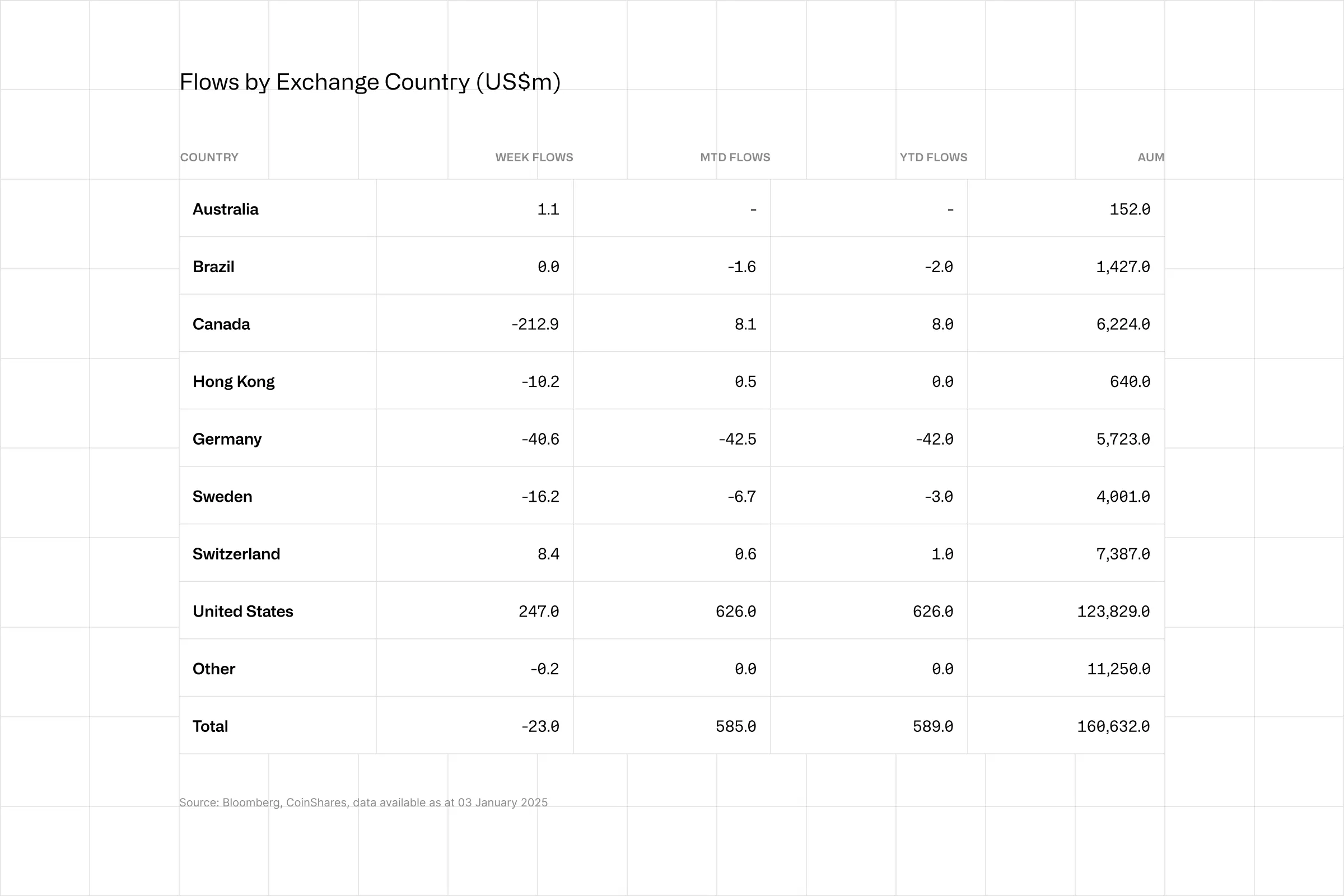 E apenas nos três primeiros dias de 2025, o mercado global já registrou um fluxo de US$ 585 milhões. No entanto, a semana completa, que incluiu os dois últimos dias de negociação de 2024, registrou saídas líquidas de US$ 75 milhões. Os dados foram publicados em um relatório de hoje pela Coinshares.