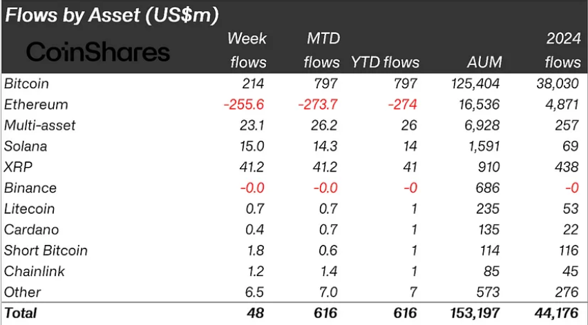 Os influxos de cripto totalizaram modestos US$ 48 milhões na semana passada, refletindo uma resposta volátil do mercado a indicadores macroeconômicos em mudança e aos recentes desenvolvimentos de política monetária nos EUA.
