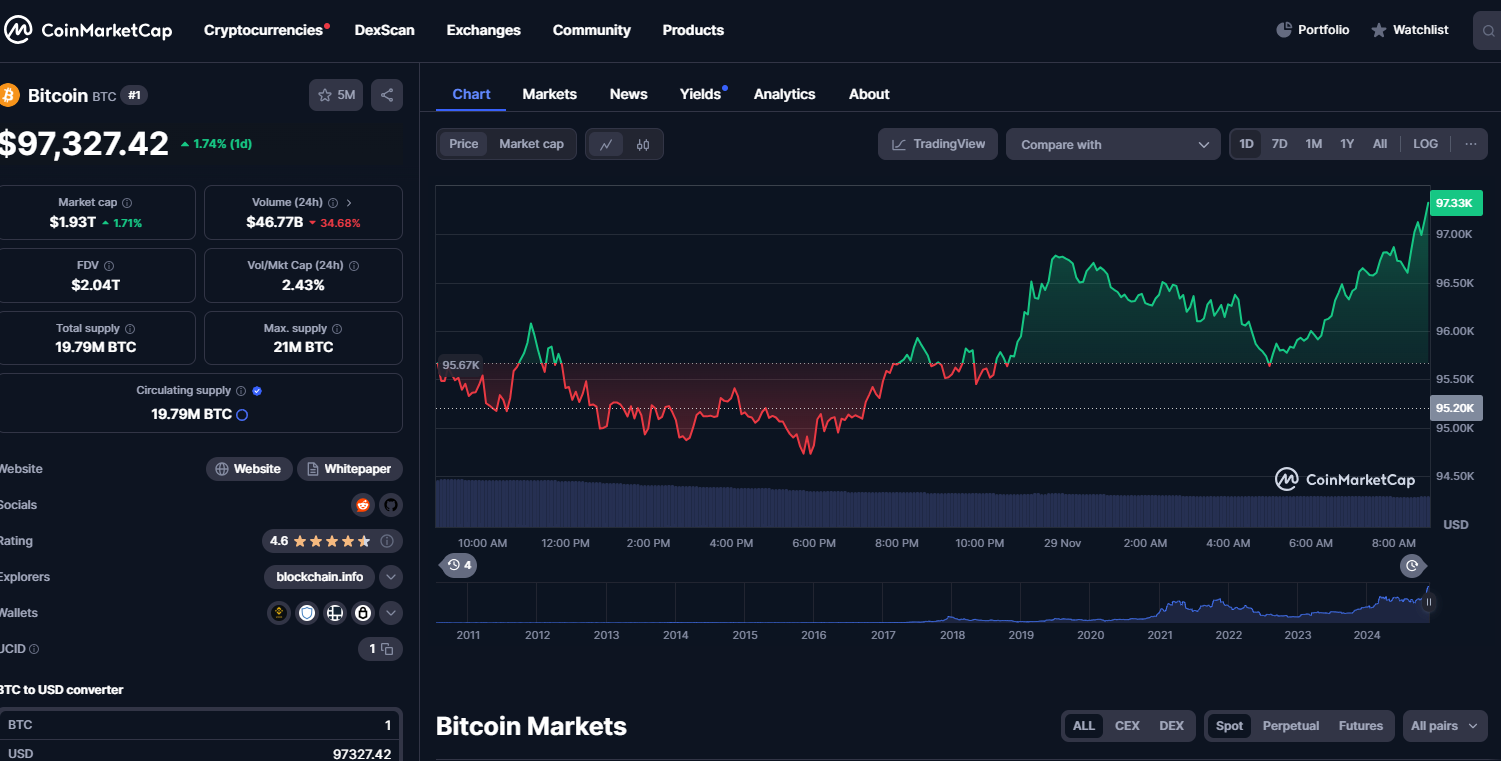Com os ETFs desempenhando um papel crucial na adoção do Bitcoin, o crescimento contínuo pode sustentar a trajetória ascendente do BTC. Previsões sugerem que o Bitcoin pode atingir novos recordes, com alguns modelos apontando para US$ 117 mil se o momento atual persistir. No momento da escrita, o BTC está sendo negociado acima dos US$ 97 mil.