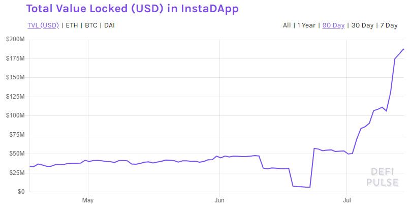 A InstaDApp está atualmente em quinto lugar em termos de TVL, superando recentemente a Aave. Somente neste mês, a TVL na plataforma aumentou 275%, de cerca de US $ 50 milhões para uma alta histórica de US $ 187 milhões.