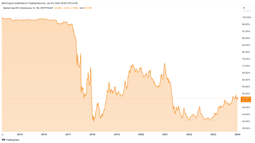 “Recentemente, vimos máximas em vários anos para o domínio do Bitcoin, mas ainda nada perto do limite máximo que atingimos no início das corridas de altas de 2017 e 2021. O domínio do Bitcoin diminuiu de 87% para 37% em 2017. Ele recuperou 70% durante sua fase de consolidação e subiu para US$ 40.000 em 2021, antes de cair para 38% no auge da bolha. Acabamos de atingir 54%. Ainda há espaço para consolidação”, argumentam analistas da empresa.
