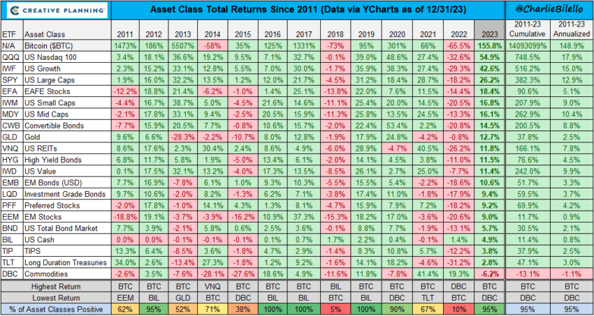 “O Bitcoin superou todas as principais classes de ativos em 2023, subindo 128%, enquanto o S&P 500 retornou 21%, o ouro retornou 12% e os títulos retornaram 2%. Esperamos que essa tendência continue em 2024, com o Bitcoin sendo negociado acima de US$ 80.000 e estabelecendo um novo recorde histórico”, escreveram analistas da Bitwise.