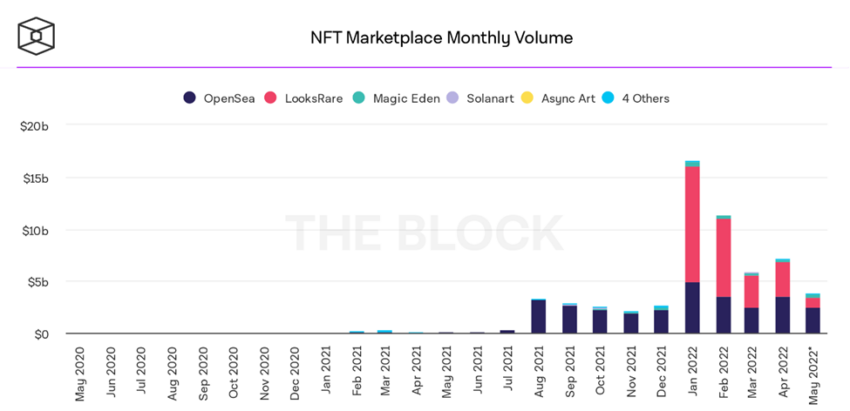 Em janeiro de 2022, os volumes mensais dos principais mercados NFT atingiram um recorde histórico de US$ 16,54 bilhões. Nos últimos dias de maio, o volume mensal total foi de aproximadamente US$ 4 bilhões, o que equivale a uma queda de 75% em relação ao volume de janeiro.