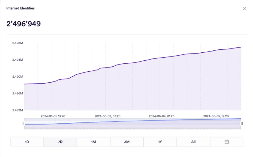O gráfico abaixo mostra uma tendência de aumento constante no número de identidades do projeto, indicando uma adoção crescente da plataforma. Mais usuários estão criando identidades, o que provavelmente indica que mais pessoas estão usando serviços e aplicativos no Internet Computer.