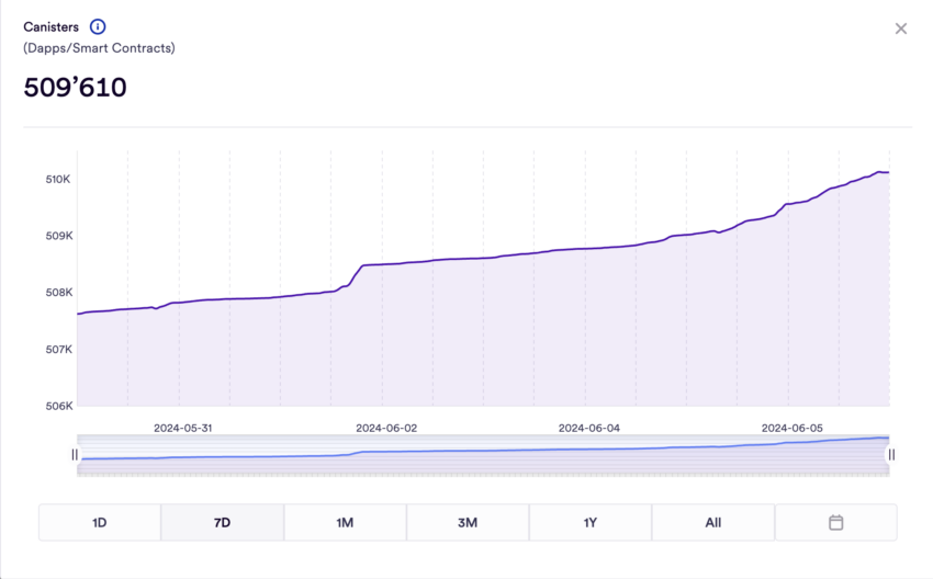 Por fim, o gráfico indica um aumento consistente no número de registros, passando de 507.000 no final de maio para quase 510.000 no momento. Esse crescimento reflete a adoção e a implantação em expansão de dApps e contratos inteligentes na rede ICP.