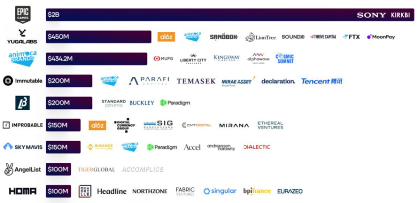 Passando para entidades individuais dentro de categorias, a gigante dos jogos Epic Games fechou US$ 2 bilhões em dinheiro de investimento da Sony e do proprietário da LEGO, KIRKBI. O criador do Fortnite usaria fundos para “avançar sua visão do metaverso e apoiar seu crescimento contínuo”. No momento da redação deste artigo, a empresa está avaliada em US$ 31,50 bilhões.