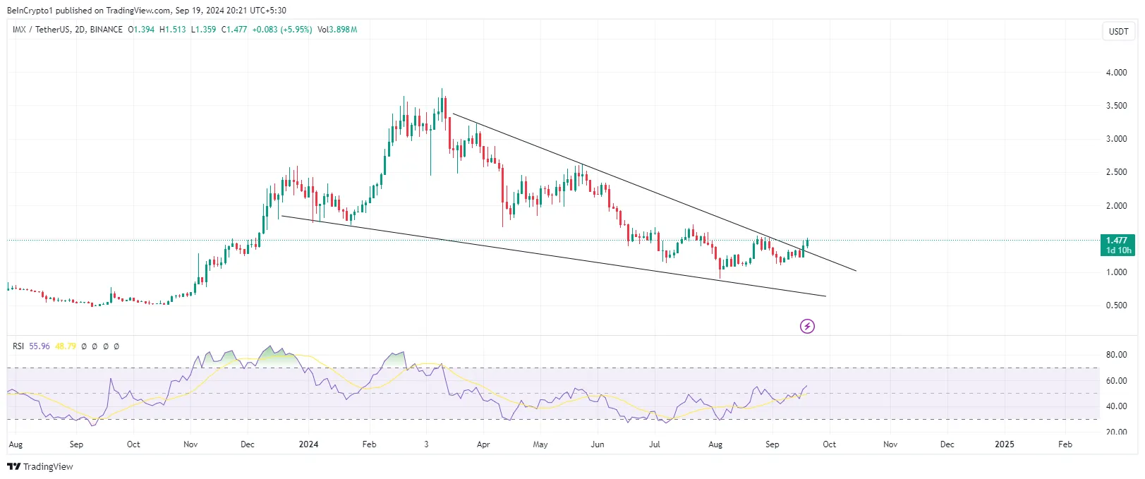 ImmutableX (IMX) também está na lista de altcoins do Crypto Banter com potencial para valorizar em uma possível altseason. O token de jogos rompeu um padrão de cunha de baixa, confirmando efetivamente uma reversão. Baseado nesse breakout, analistas esperam uma onda altista.