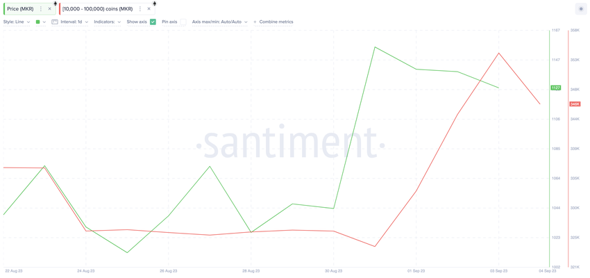 Na sexta-feira (1), um dia antes da transação de Vitalik, investidores que detinham entre 10.000 e 100.000 MKR tinham apenas 333.000 tokens em seus saldos acumulados. Mas, agora, eles aumentaram seu saldo para 346.000 MKR.