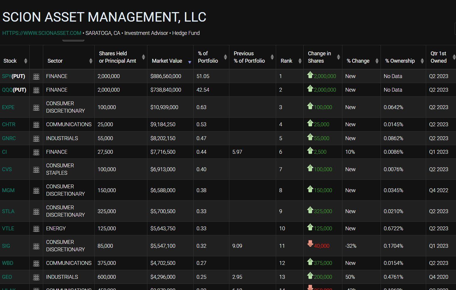 De acordo com os registros de valores mobiliários divulgados em 14 de agosto, a Scion comprou opções de venda com um valor nocional de US$ 886 milhões contra o SPDR S&P 500 ETF Trust. O fundo acompanha o S&P 500, um amplo índice de mercado que busca capturar o desempenho geral do mercado de ações de grande capitalização dos EUA.