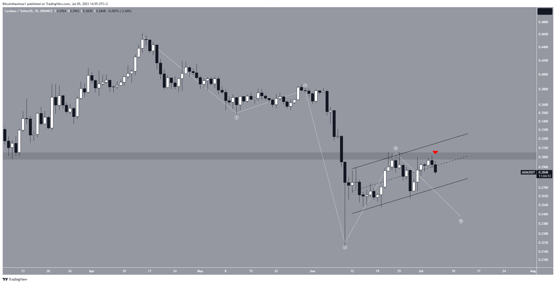 A ação de preço do gráfico diário e na contagem de ondas indica uma perspectiva negativa para a ADA. Em primeiro lugar, a ação de preço dá dois sinais de baixa. A primeira é que a área de resistência horizontal de US$ 0,30 não foi superada, enquanto a segunda é que a ADA está negociada dentro de um canal paralelo de alta.
