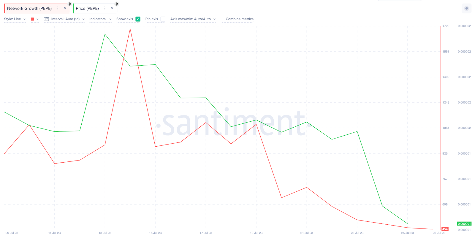 Conforme ilustrado abaixo, o crescimento da rede PEPE diminuiu desde o início da alta de preços da DOGE em 14 de julho. Indicativamente, entre 14 e 25 de julho, o crescimento da rede caiu 73%, de 1.703 para 463 novos endereços.
