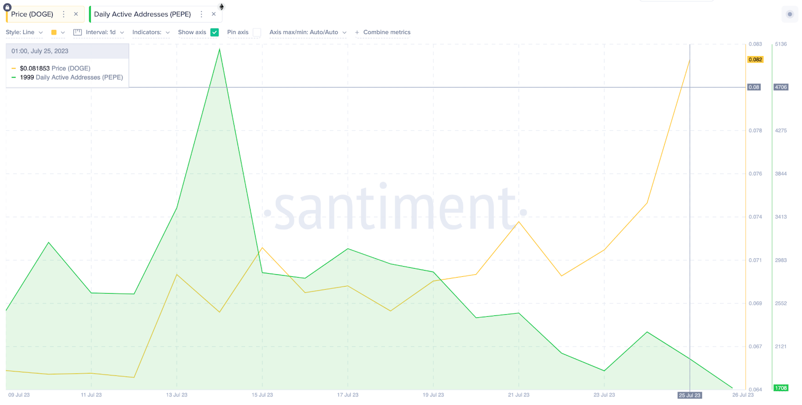 Os dados on-chain indicam que os investidores começaram a abandonar a rede PEPE assim que o preço da Dogecoin começou a subir em meados de julho. O gráfico da Santiment abaixo ilustra que, em 12 de julho, o preço da DOGE (linha amarela) iniciou uma alta de 25%, de US$ 0,065 para os US$ 0,082 registrados em 26 de julho.