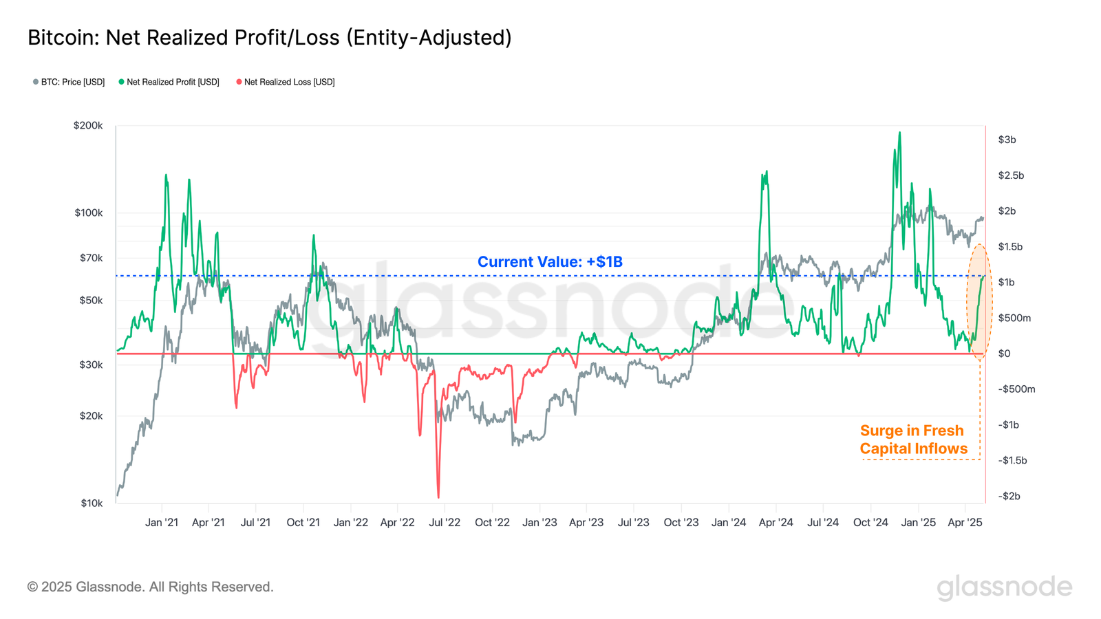 Nas últimas semanas, observamos mais de US$ 1 bilhão em entradas líquidas diárias de capital, sinalizando um retorno da força do lado da demanda para o Bitcoin. A métrica de Lucro/Prejuízo Realizado Líquido reflete essas entradas, mostrando que os novos investidores estão absorvendo a oferta entrante. Vendedores estão capitalizando seus lucros, enquanto compradores continuam adquirindo Bitcoin ao preço de mercado atual.