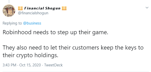 O aplicativo Robinhood suporta a negociação de um punhado de criptomoedas, incluindo bitcoin, Ethereum, Dogecoin e outros. Semelhante às ações, não há comissão para negociar criptomoedas. Uma coisa que a exchange não oferece aos investidores, no entanto, é o controle de suas próprias moedas. Robinhood diz que armazena as moedas compradas em sua plataforma de negociação usando uma combinação de carteiras frias e quentes, as quais dependem para transações diárias. Os usuários têm pressionado pelo controle de suas próprias chaves para seus acervos de cripto já há algum tempo.